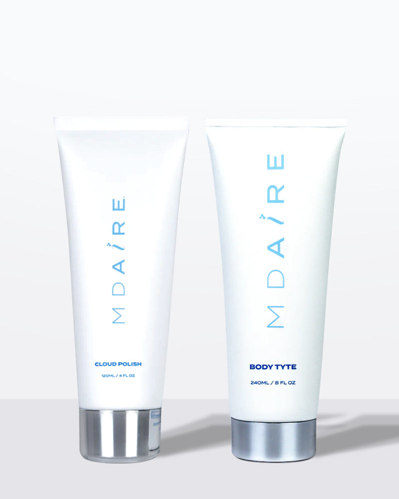 MDAIRE's Body Glow Duo will help you achieve smooth, glowing skin from head to toe with our Body Glow Duo. This pair of products exfoliates, protects and firms, enhancing your skin's natural glow.