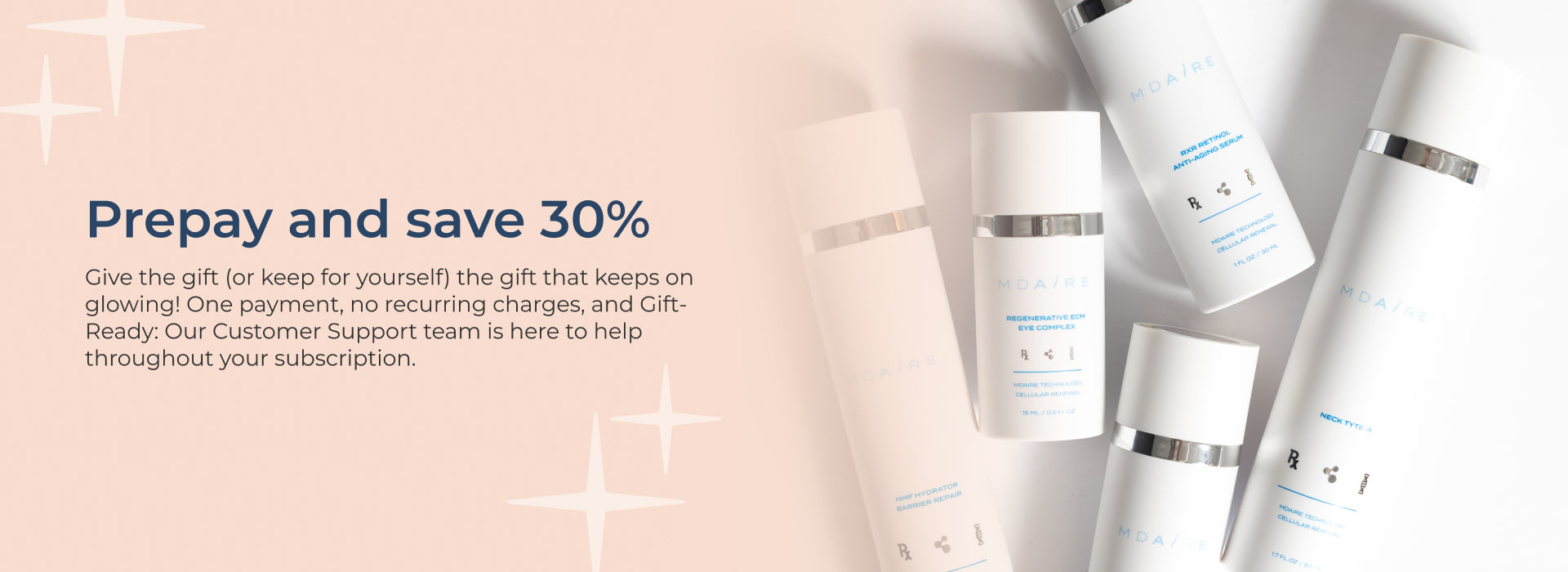 Our exclusive holiday prepaid subscriptions are here — designed to deliver months of curated MDAiRE essentials with one upfront payment. Each subscription begins shipping December 10th and continues monthly, making it the most luxurious way to gift real, visible results.